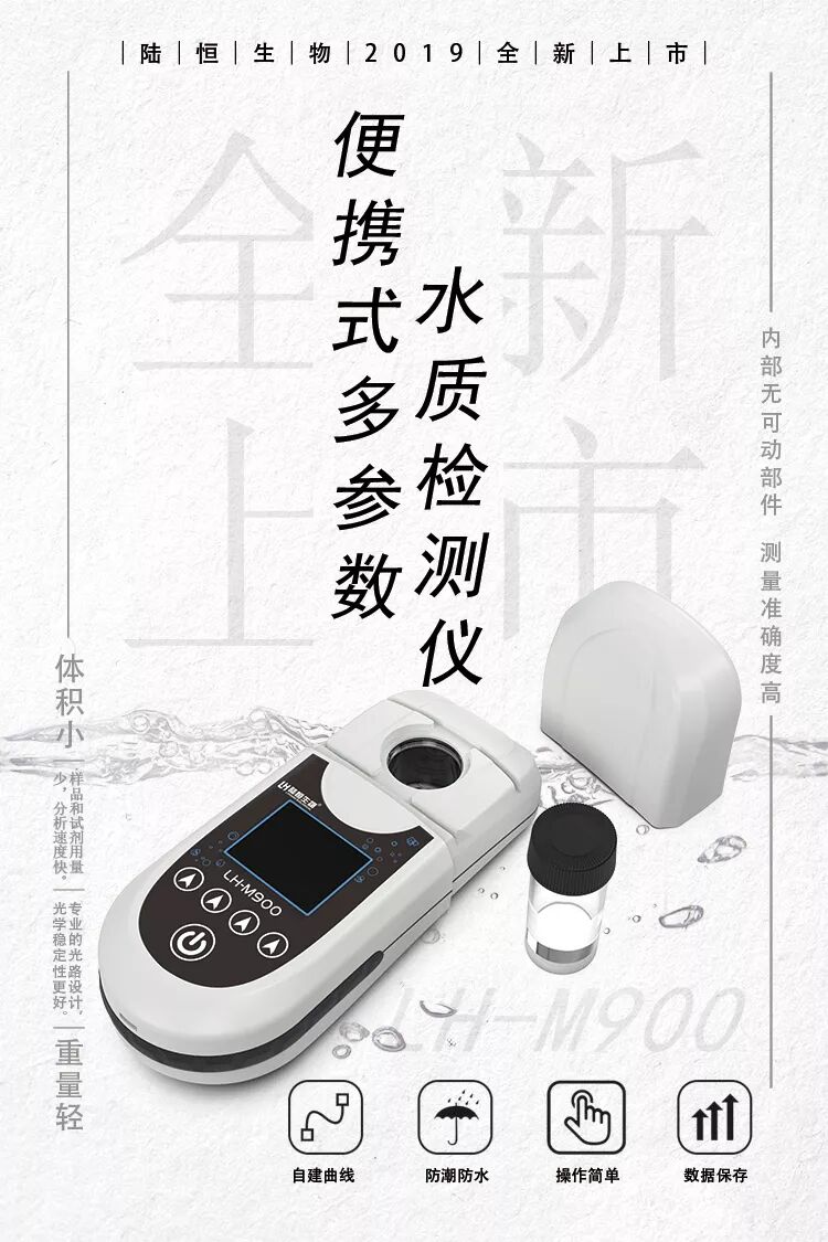 LH-M900型便携式多参数水质检测仪采用分光光度法,支持420nm、470nm、520nm和620nm波长,可支持多种参数检测。经大量实验证明,此方法操作简便快捷,灵敏度高。仪器体积小、重量轻、便于携带,适合在野外和现场使用。