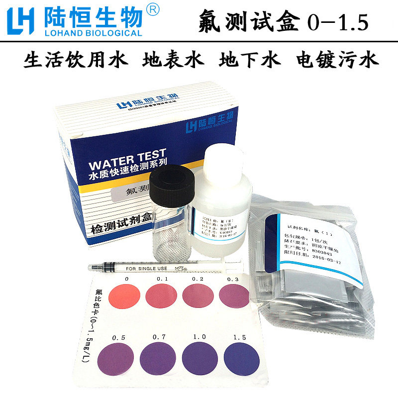 取一洁净比色管,加水样至10ml刻度线,加入一包氟(1)试剂,改好,振摇至完全溶解,开盖,加入1ml氟(2)试剂,摇匀,静置5分钟,于光线充足处,将管垂直提高至距比色卡空白区约1cm,自管口向下目视比色,与管中溶液色调相同的色阶指示的浓度即为水样液中氟的含量(mg/L)。